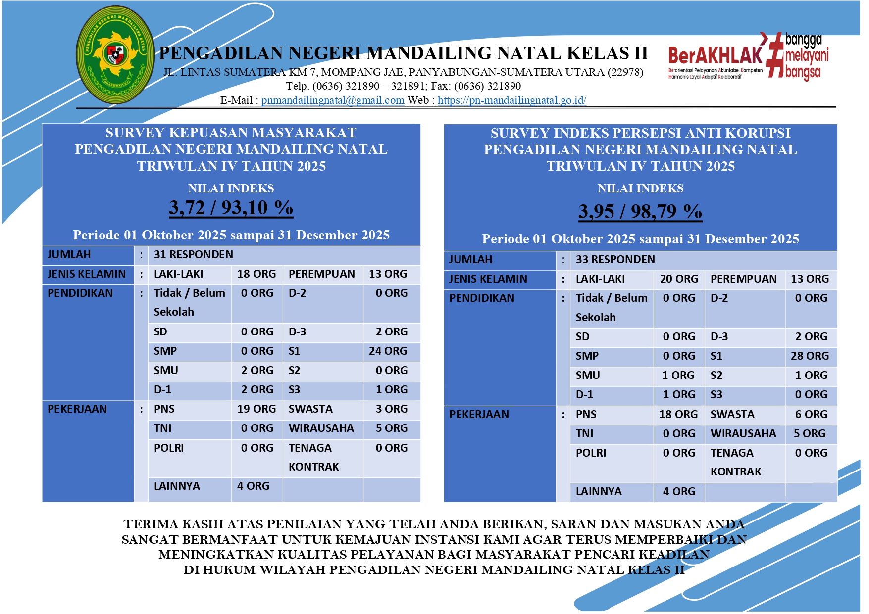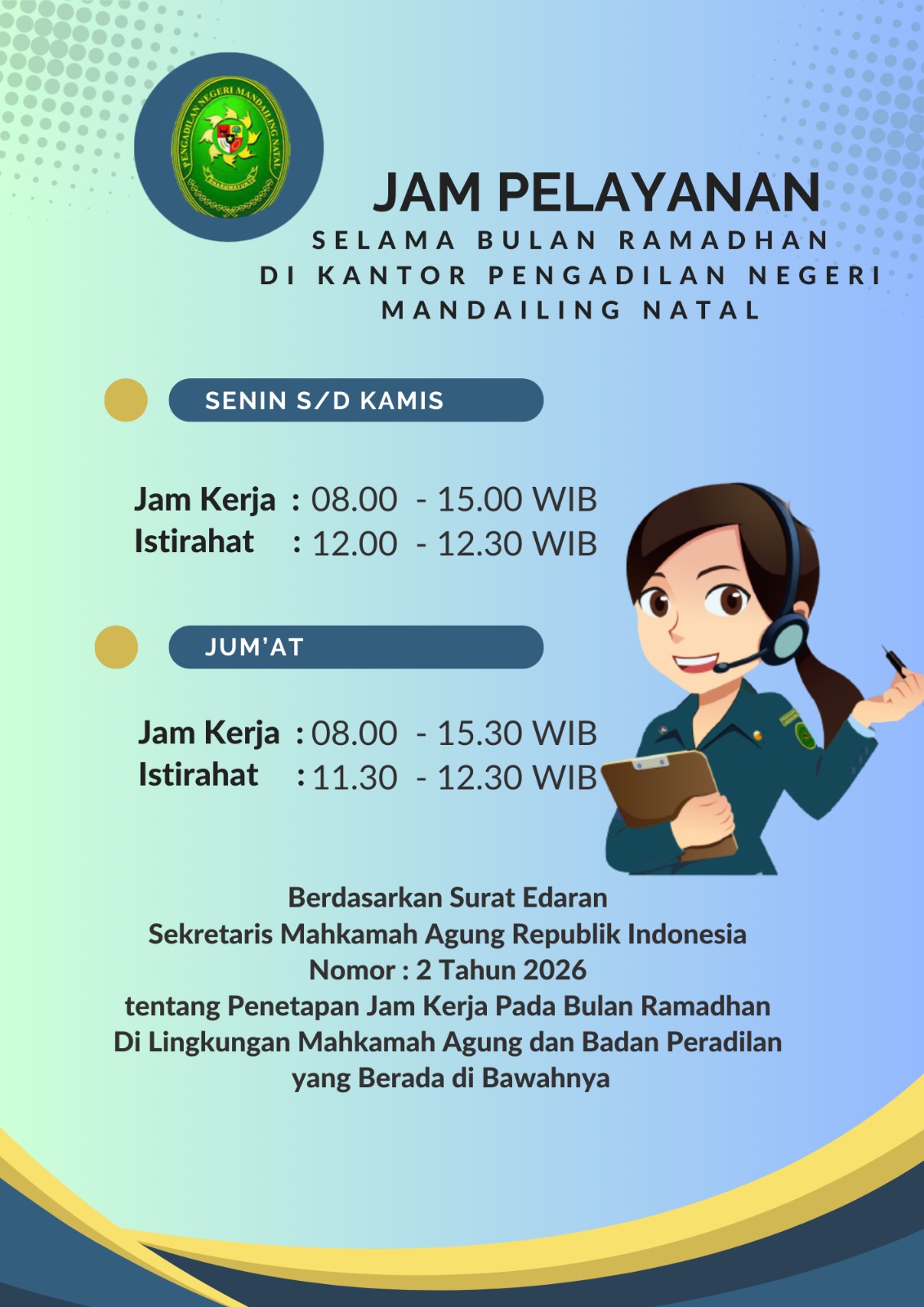 Dalam mewujudkan program Mahkamah Agung RI yaitu pembangunan Zona Integritas menuju Wilayah Bebas Korupsi (WBK) pada badan peradilan di bawahnya, maka Pengadilan Negeri Mandailing Natal pada Jum’at tanggal 30 Januari 2026 menggelar kegiatan Public Campaign . Kegiatan dimulai pada pukul 09.00 WIB dengan dipimpin oleh Wakil Ketua Pengadilan Negeri Mandailing Natal, Bapak Hasnul Tambunan, S.H., […]