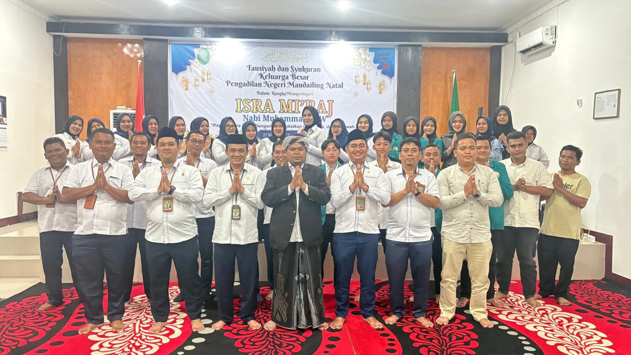Keluarga besar Pengadilan Negeri (PN) Mandailing Natal (Madina) menggelar kegiatan tausiyah dalam rangka memperingati Isra Mi’raj Nabi Muhammad SAW 1447 H. Kegiatan yang berlangsung khidmat ini dilaksanakan di Ruang Sidang Utama Pengadilan Negeri Mandailing Natal, Senin (19/1).