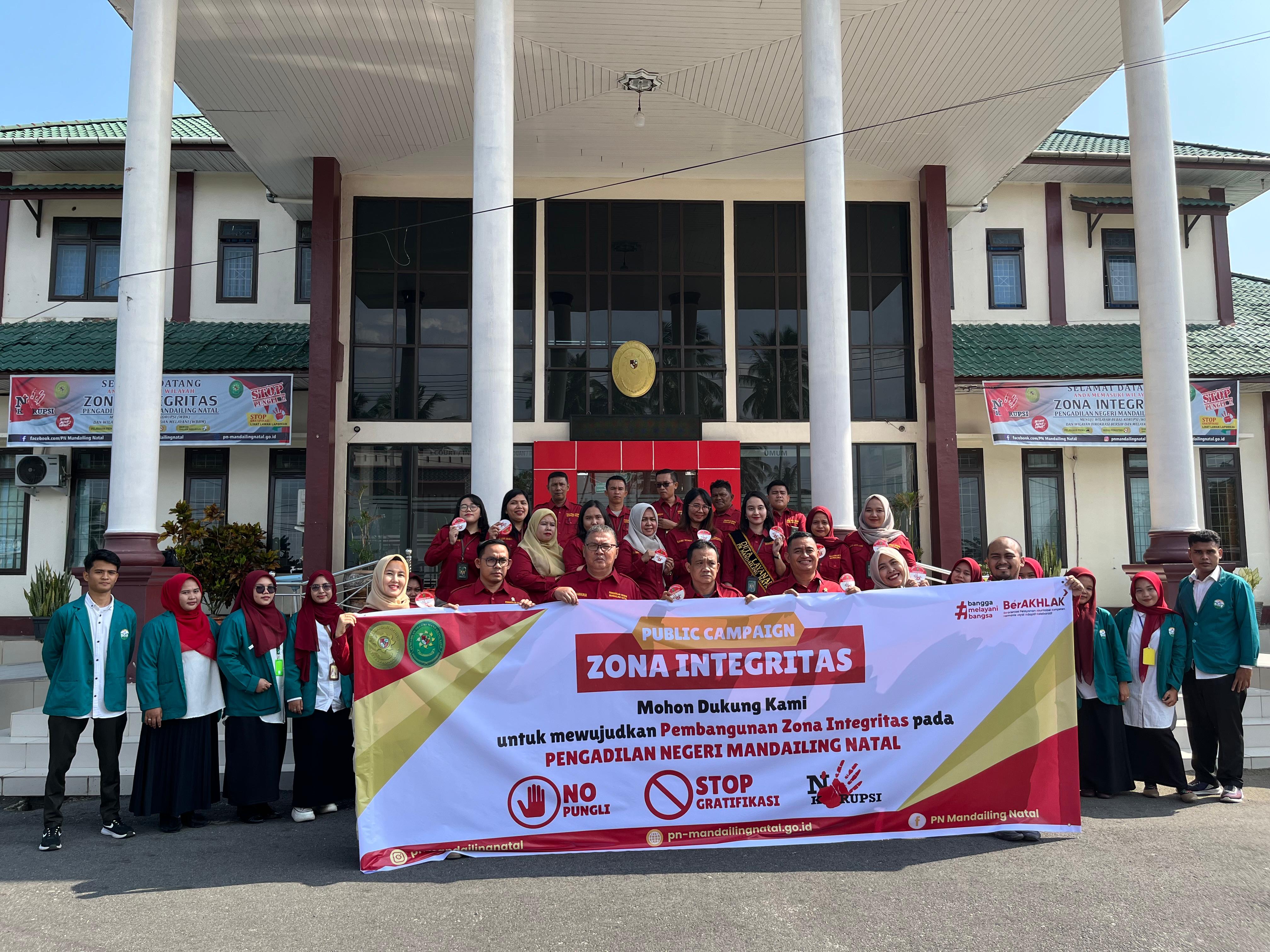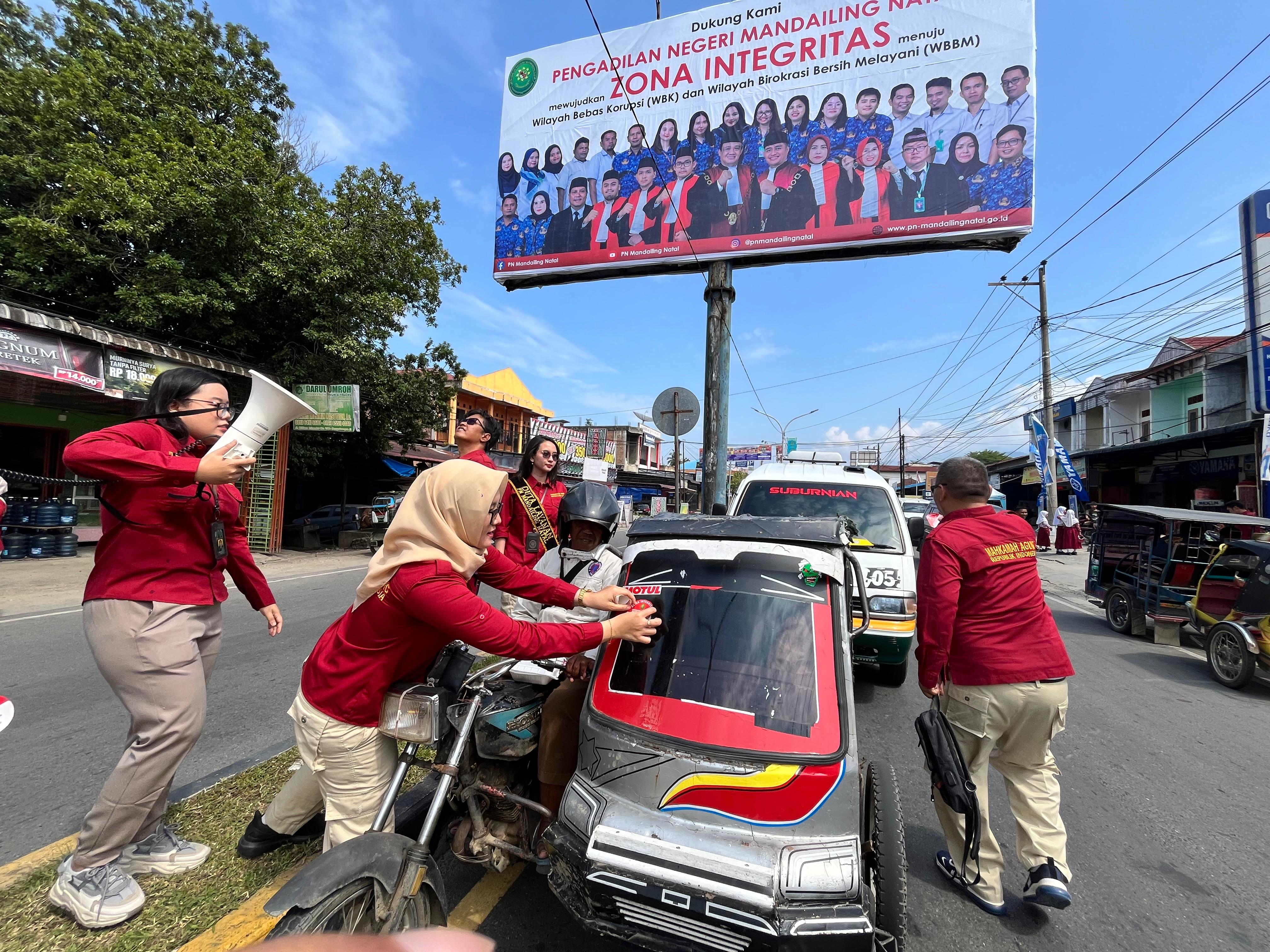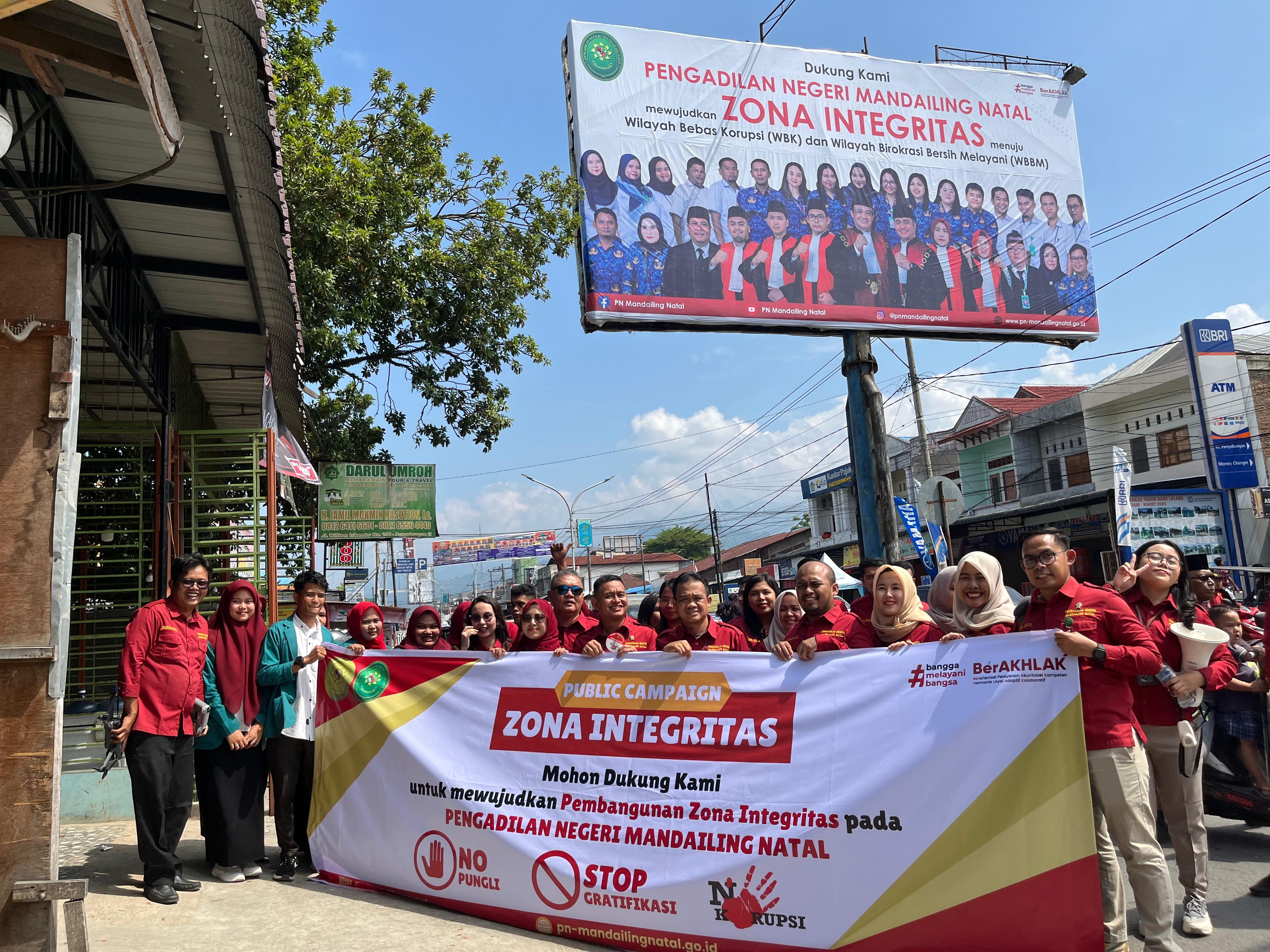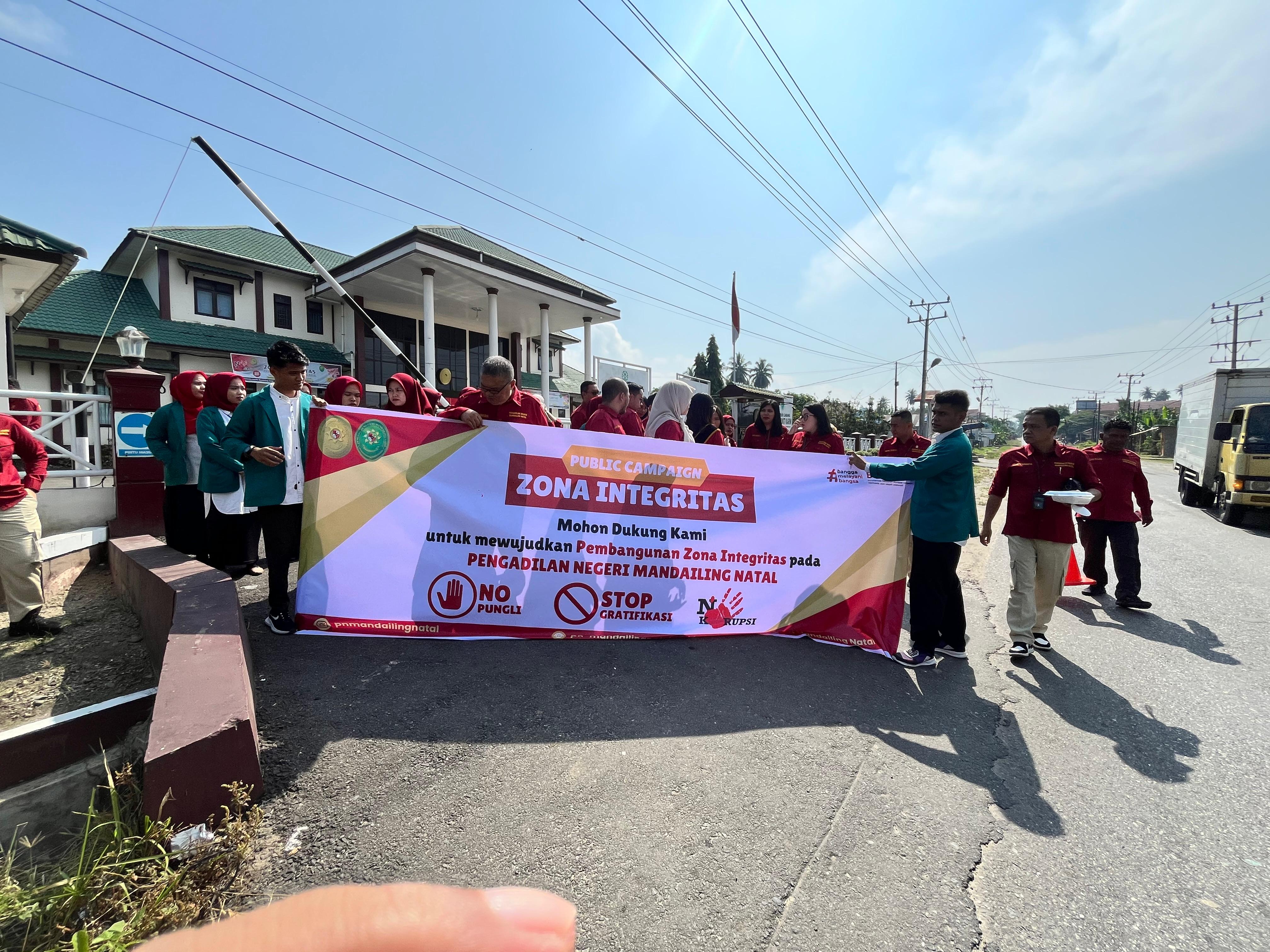 Panyabungan – Sebagai upaya mewujudkan Zona Integritas menuju Wilayah Bebas Korupsi (WBK) dan Wilayah Birokrasi Bersih Melayani (WBBM), Pengadilan Negeri Mandailing Natal melaksanakan kampanye publik (public campaign) di Simpang Jalan ABRI, Panyabungan, Rabu (12/02/2025) pagi.
