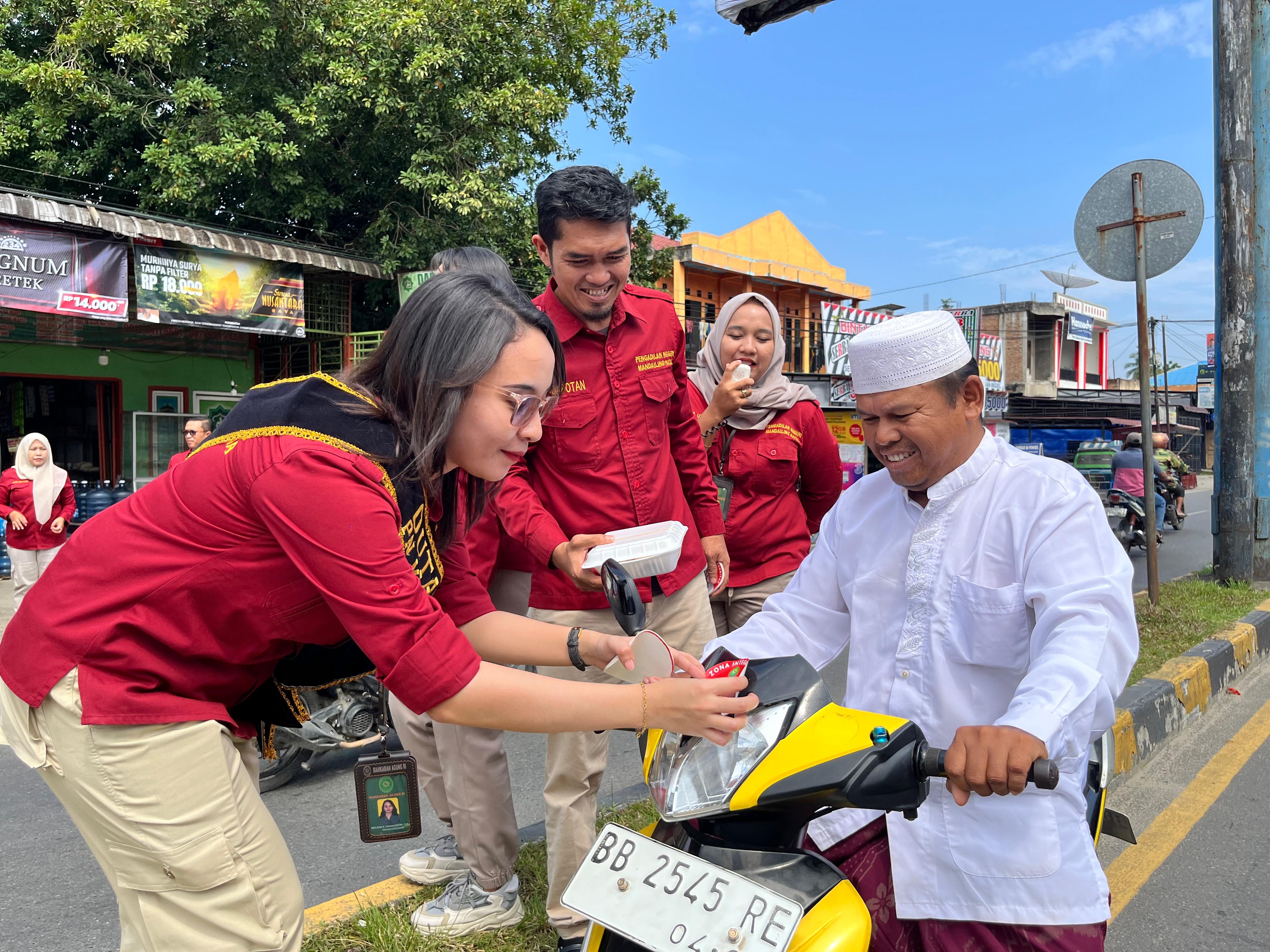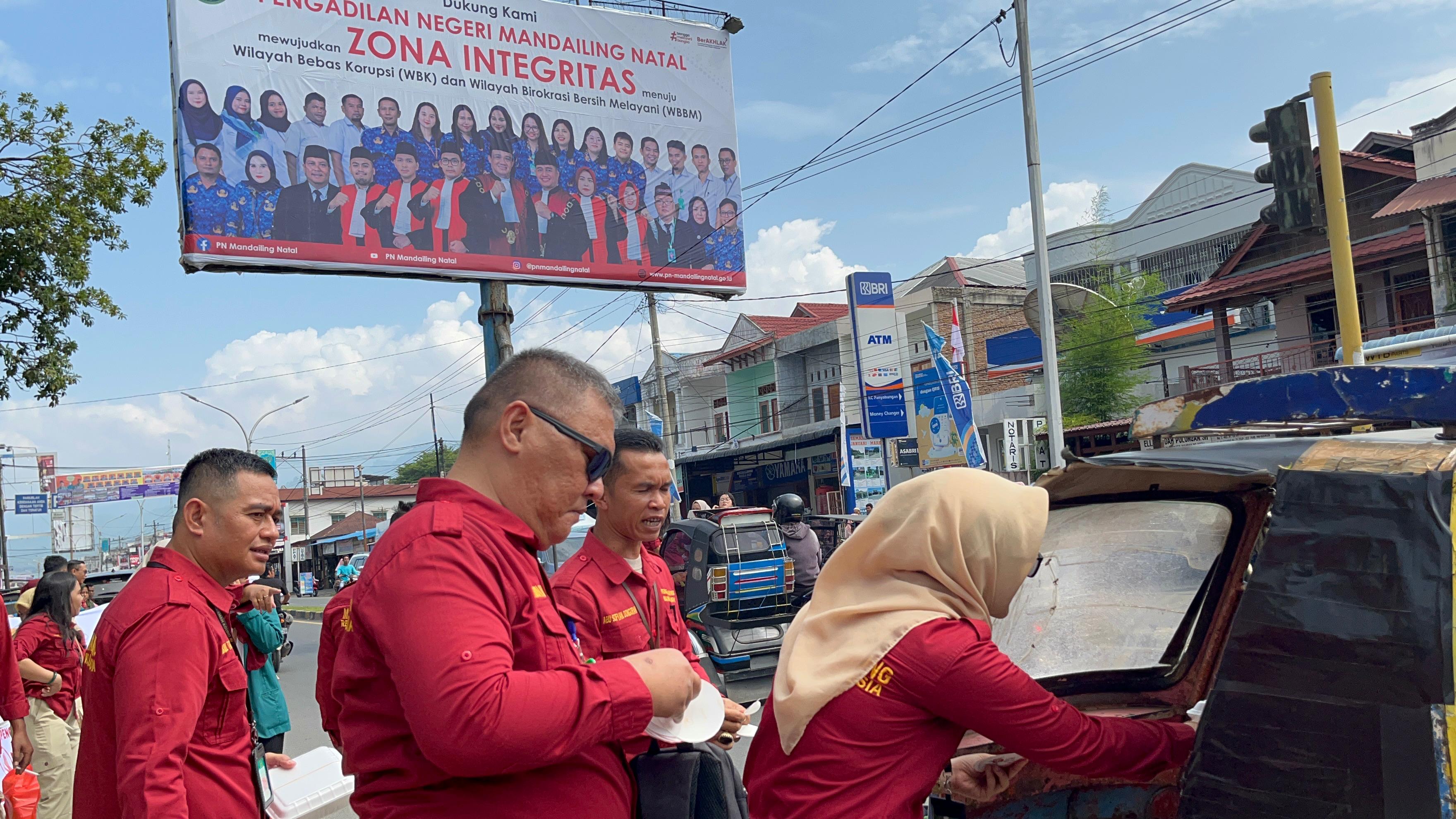 Kegiatan public campaign tersebut dilakukan dengan pembagian sticker bertuliskan ‘PN Mandailing Natal No Gratifikasi, No Korupsi, No Suap, No Pungli’ serta sarapan gratis bagi masyarakat yang dibagikan oleh seluruh aparatur Pengadilan Negeri Mandailing Natal di 2 (dua) lokasi, yaitu depan kantor PN Mandailing Natal dan simpang traffic light Jalan ABRI Panyabungan.