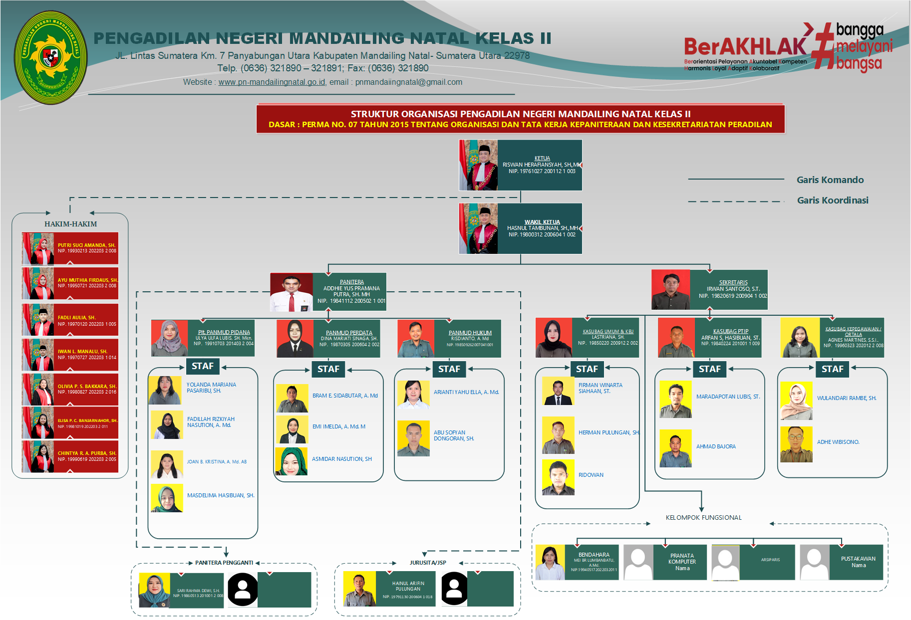 Mandailing Natal, 28 Oktober 2025 – Dalam rangka memperingati Hari Sumpah Pemuda ke-97, Pengadilan Negeri Mandailing Natal menggelar upacara bendera yang berlangsung dengan khidmat di halaman kantor Pengadilan Negeri pada Selasa (28/10/2025) pagi. Upacara dimulai pukul 08.00 WIB dan diikuti oleh seluruh aparatur Pengadilan Negeri Mandailing Natal, mulai dari para hakim, pejabat struktural dan fungsional, staf dan PPPK. Bertindak sebagai inspektur […]Lebih LanjutStruktur Organisasi